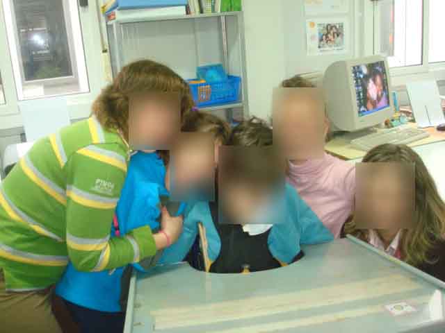 Mesa recortada: serve para que as crianças em cadeira de rodas consigam ter uma postura correcta na mesa de trabalho.